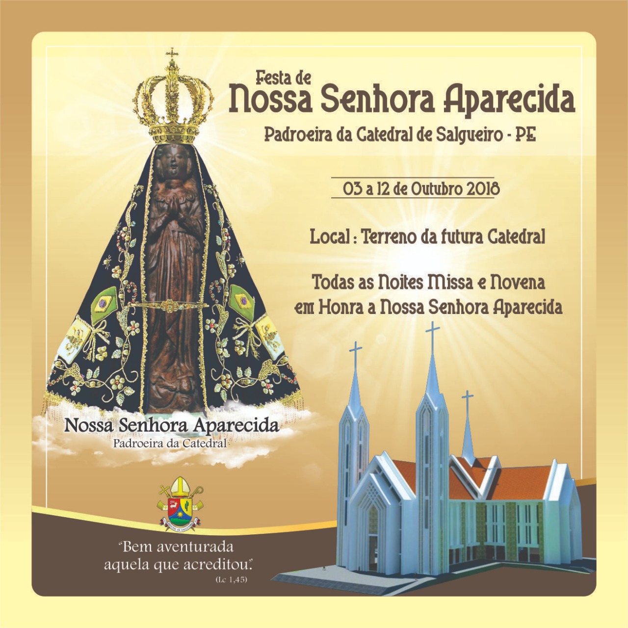 O novenário terá início no dia 03 de outubro, quarta-feira. Pela manhã, a exemplo do sucesso do ano anterior, acontecerá a grande cavalgada pelas principais ruas da cidade, escoltando a imagem venerada da Mãe de Deus e a noite a celebração de introdução aos festejos no antigo terreno da CAGEPE. Como de praxe, todas as noites haverá momento cultural, quermesse e animação. Construir a nova Igreja mãe da diocese é um sonho cujo cume depende da solidariedade de todos aqueles que amam a Deus. Colabore, ajude, participe deste momento memorável. Vamos construir juntos a casa da Mãe Aparecida!